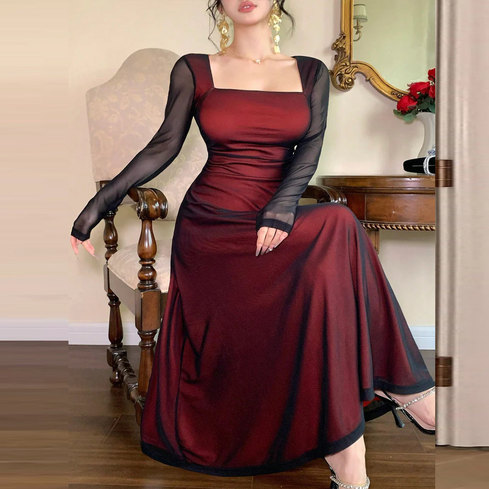 Elevate your special occasions with our stunning Square Neck A-Line Dress, designed for weddings and festive celebrations like Ramadan, Id al-Adha, and Eid al-Fitr. This elegant piece features a flattering high waist and a flared hem that gracefully enhances your silhouette. Crafted from soft knitted fabric, it boasts long regular sleeves and a chic contrast mesh detail, while the ruched design adds a touch of sophistication. The slim fit ensures a tailored look, making it the perfect choice for those who appreciate style and comfort. Complete with a convenient zipper, this midi dress is a must-have for your wardrobe.